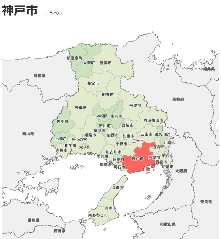 이 중 니시고, 미카게고, 우오자키고는 지금의 고베시에 있고 이마즈고, 니시노미야고는 고베의 동쪽의 니시노미야시에 위치하고 있습니다.