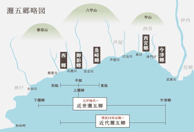 그 다섯개의 마을은 니시고(西郷), 미카게고(御影郷), 우오자키고(魚崎郷), 이마즈고(今津郷町), 니시노미야고(西宮郷)입니다.