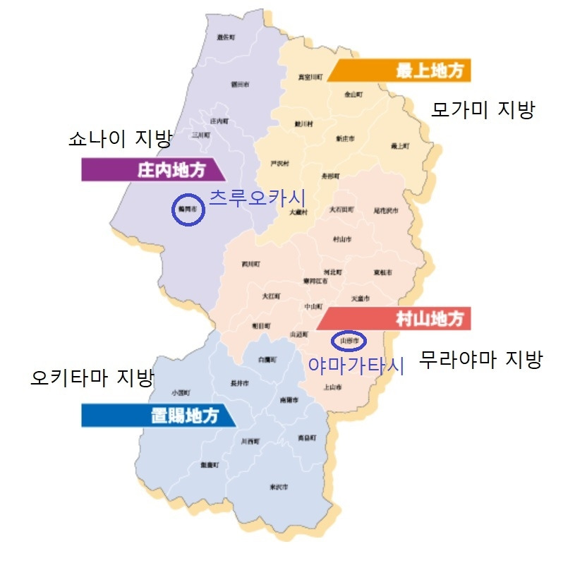 야마가타의 4가지 세부지역 구분 - 쿠도키죠즈(くどき上手)는 쇼나이지방(庄内地方) 츠루오카(鶴岡)에서 생산된다.