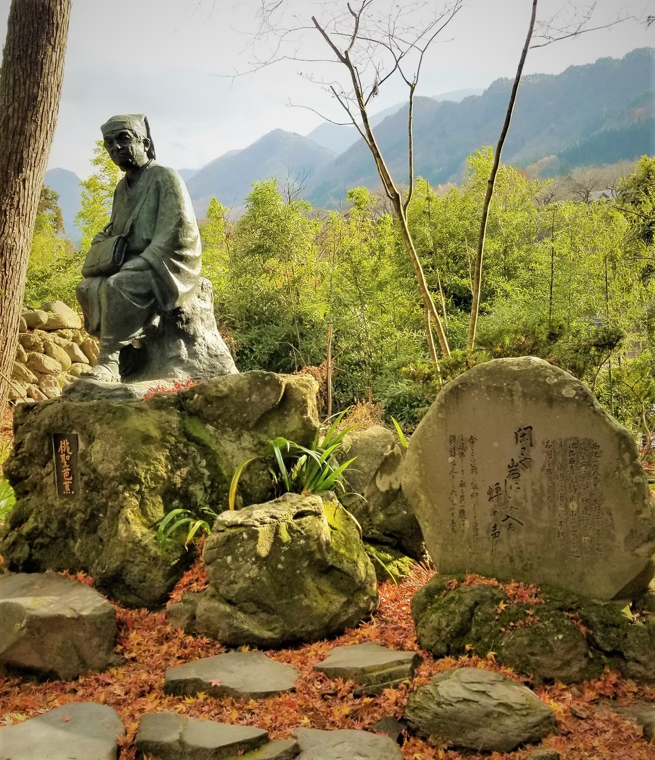 야마데라(山寺) 등산로에 있는 마츠오바쇼(松尾芭蕉) 동상과 하이쿠(俳句) 비석