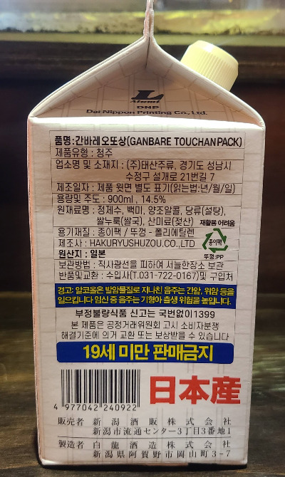 일본내의 종이팩 사케는 교토 후시미와 고베 나다의 대형 양조장들이 시장을 석권하고 있어서 그 틈이 없었던 이유도 있었을 것이고 또 그 대량 생산되는 수준낮은 사케에 비해서는 깔끔하고 산뜻한 맛이 한국에 잘 어필될 수 있었던 이유도 있었을 것입니다.