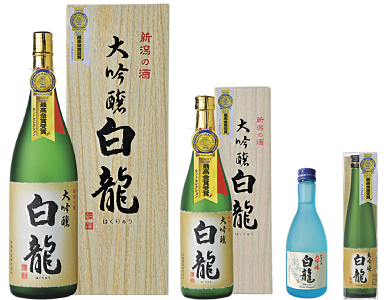 니가타 특유의 담려한 주질과 깔끔한 맛으로 사랑을 받아오다, 니가타현의 주조호적미인 코시탄레이라는 쌀을 사용해 '다이긴죠 하쿠류'를 출시하게 되었는데 이 라인업이 대박을 터뜨리게 됩니다. 저온에서 숙성을 천천히 진행시켜 일반 사케의 2배의 시간을 들여 빚어내는 등 상당히 심혈을 기울여 양조하고 있는 이 라인업은 몽드셀렉션에서 1994년부터 2017년까지 무려 25년 연속 금상을 수상해 25년 연속수상자에게 주어지는 프레스티지 트로피를 받게되면서 전국 및 세계적으로 이름을 알리게 됩니다.