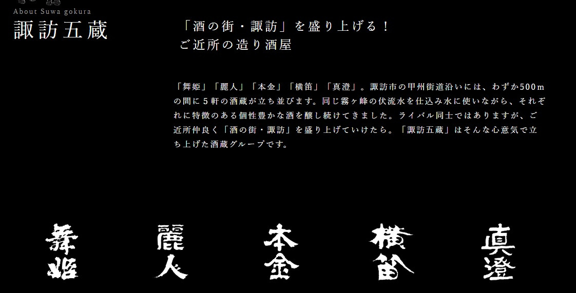 스와고쿠라(諏訪五蔵)는 마이히메(舞姫), 레이진(麗人), 혼킨(本金), 요코부에(横笛), 마스미(真澄)를 말하는데, 모두 500미터 이내에 모여있다.