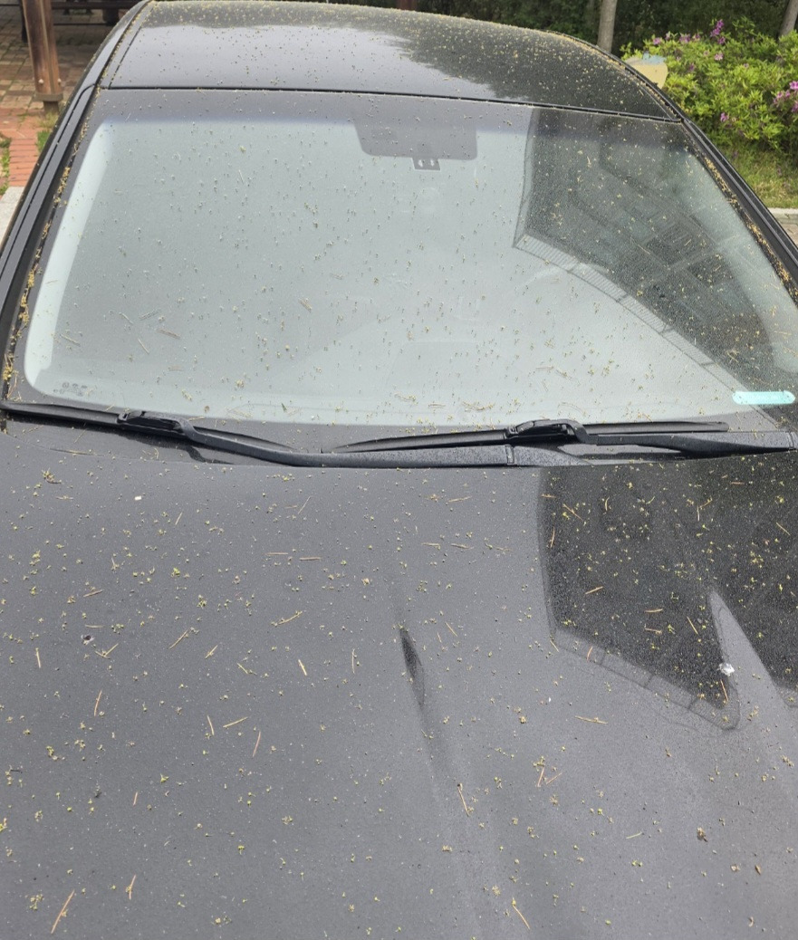 아니, 맞았다. 그 차는 우리 민트였다. 민트는 온몸에 끈적끈적한 송진을 묻히고 처량하게 서 있었다. 송진 때문에 송홧가루와 솔잎과 동그란 초록색 알갱이들이 마치 튜닝이라도 한 듯 온몸에 덕지덕지 붙어 있었다. 이게 뭐야. 또 내 차만... 왜 내 차만 또 이렇게 더러운 거야. 뇌가 멈췄다. 안 그래도 차알못인 내 머리로는 도무지 해결책이 떠오르지 않았다. 자동 세차로는 안 될 거고. 지난번에 나오는 골목길에서 차들 사이에 끼는 바람에 식겁해서 반년 동안 안 가겠다고 다짐했던 그 세차장이 생각났다. 전화를 해서 상황 설명을 하니 세차 가능하다고 해서 일단 교회 갔다가 가기로 했다. 앞유리에도 송진과 초록색 가루가 잔뜩 버무려져 있어서 앞이 잘 안 보였다. 무서워서 심장이 쿵쾅쿵쾅 뛰었다. 다행히 오늘따라 차가 거의 없고 한적했다. 마치고 혼자 가는 게 무서워서 교회 언니에게 부탁해서 같이 갔다.