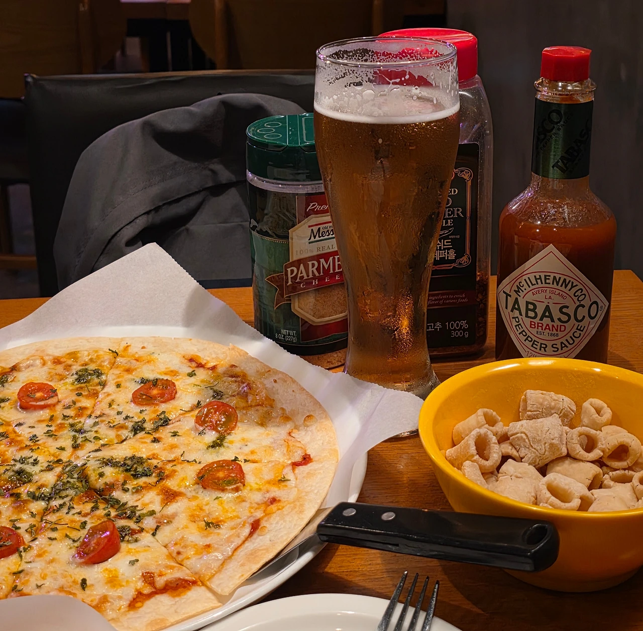 땡. 틀렸다. 난 먹을 수 있다. 단지 창피할 뿐이다. 혼자 와서 세트메뉴를 먹어 치운다는 게 왠지 모르게 부끄러울 뿐이라고. 안 되겠다. 오늘은 일단 후퇴다. 마르게리타 피자와 생맥주 한 잔을 시켰다. 앉아서 기다리는데 아저씨들이 피데기 오징어를 추가 주문했다. 곧 오징어 굽는 냄새가 주방에서 홀까지 퍼져 나왔다. 맛있겠다... 다음번에 와서 피데기 사 먹어야지. 냄새를 맡으며 멍을 때렸다. 오늘도 고단한 하루가 다 갔다.