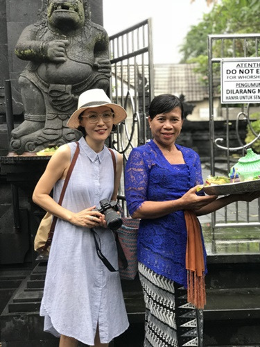 ▲ 짜낭사리를 든 발리여인과 포즈를 취했다. [사진: 채인숙]