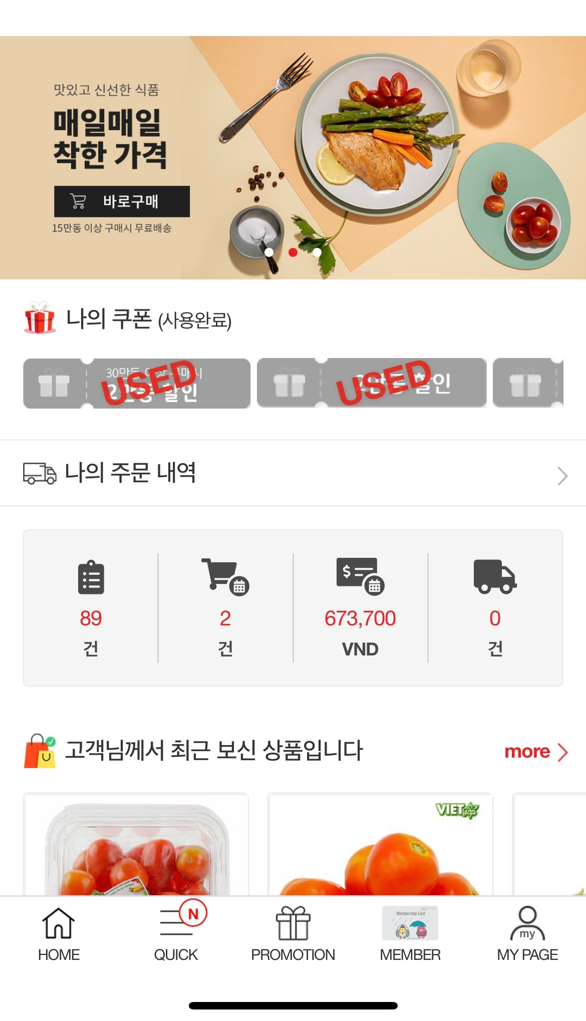 배달 앱보다 자주 사용하는 롯데마트 어플 Speed L. 롯데마트는 베트남 여러 지역에 입점해 있고, 어플에서 한국어도 제공하기 때문에 한국인이 정말 편하게 사용할 수 있다. 적립된 포인트로는 물건을 저렴하게 구매하거나, 베트남 롯데 시네마 티켓도 살 수 있다.