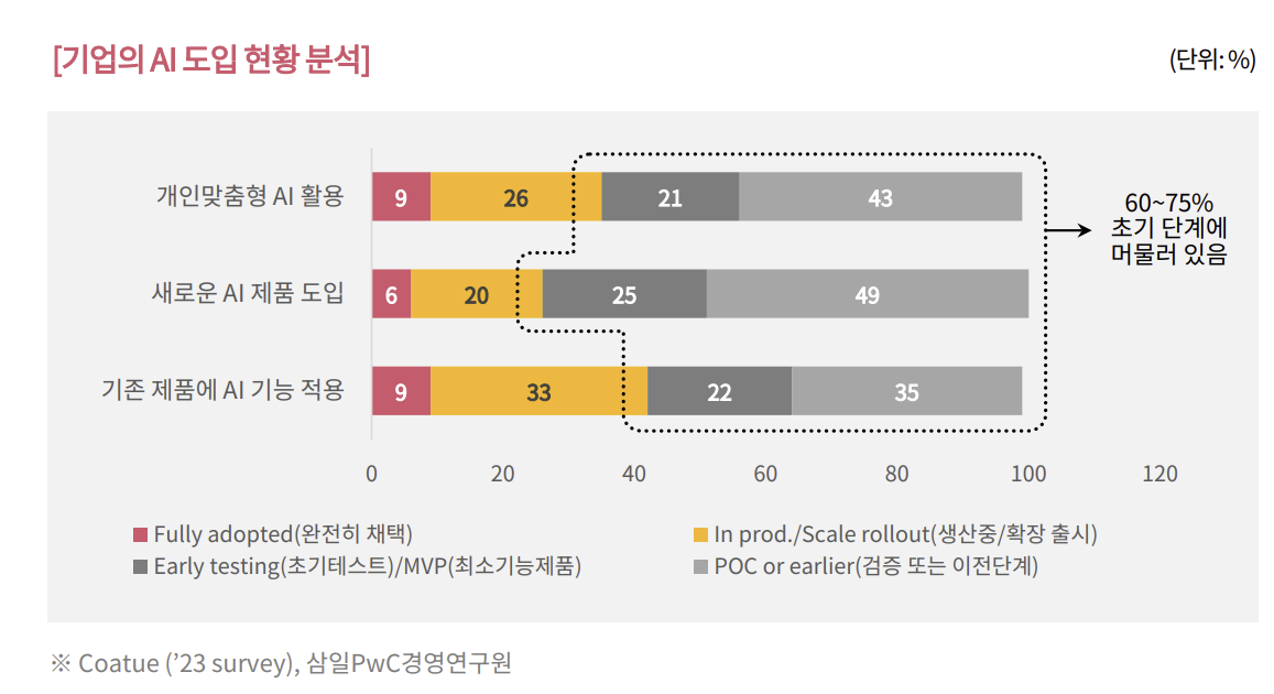 먼저 시장 상황을 보겠습니다. 생성형 AI를 도입하려는 기업들의 관심은 날로 증가하고 있지만, 실제로 이를 효과적으로 활용하는 사례는 아직 초기 단계에 머물러 있습니다. 기술 도입 자체는 쉽지만, 이를 비즈니스 모델로 구체화하고 재무적 성과로 연결하는 것이 기업들에게는 큰 도전 과제이죠. 생성형 AI 시장이 유망하다는 전망에도 불구하고, 기업의 AI 활용 수준은 60~75%가 여전히 초기 단계에 머물러 있습니다.