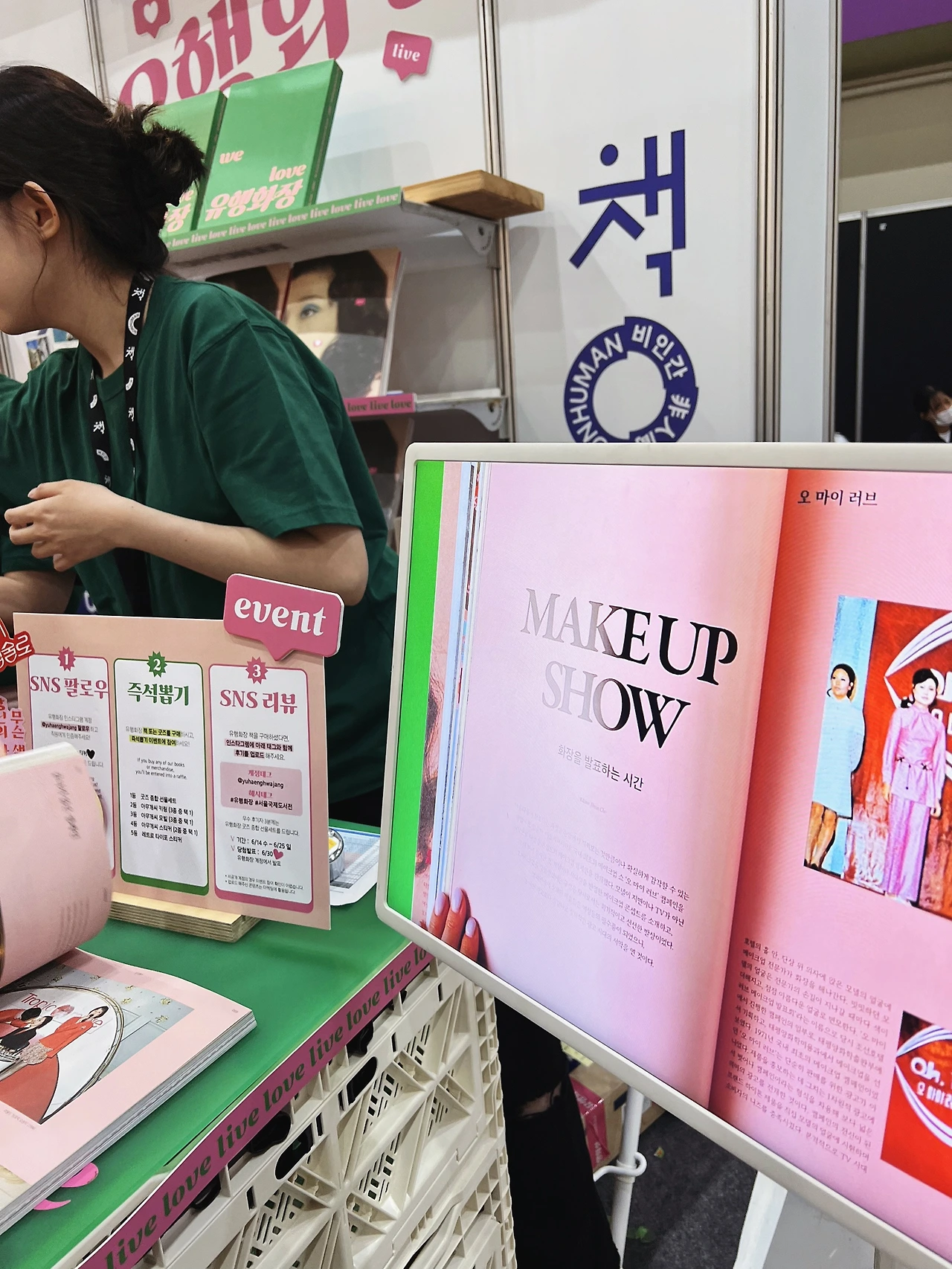 이색적인 이모저모. 아모레퍼시픽에서도 <유행화장> 카탈로그를 킬러 콘텐츠로 해서 이번 도서전에 참전(?)하였다. 전시장에서 나가려고 출구를 향해서 가는데 벽에 붙어있는 기나긴 대기줄이 보인다. 알고 보니 이슬아 작가 사인 대기줄이라고. 나는 대기까지는 못 하고 부스에서 알짱거리면서 어깨 너머로 봤는데 - 연예인 아우라더라. 하긴, 출판업계 연예인 맞지. 그것도 슈퍼스타.