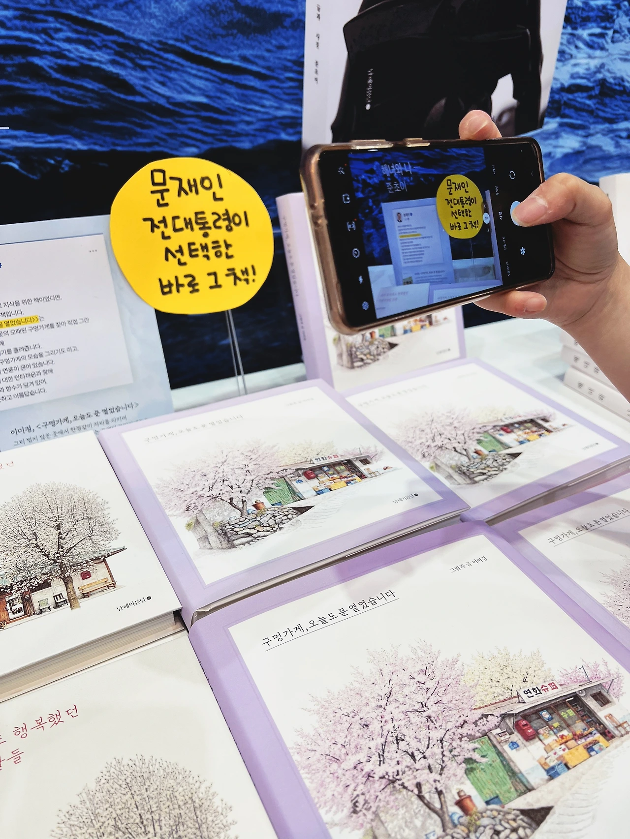 이미경 작가의 <구멍가게, 오늘도 문 열었습니다> 일러스트 에세이집은 이미 집에 오리지널 에디션이 있는데 (그것도 통영 가서 산!) 이번 도서전 한정 연보라색 리커버 에디션의 유혹에 이기지 못하고 한 부 집어들었다. 안 그래도 문재인 전 대통령 (aka 출판업계 셀럽) 추천 때문에 요즘 물 들어온 김에 노 젓고 있는 듯 한데. 후후후.