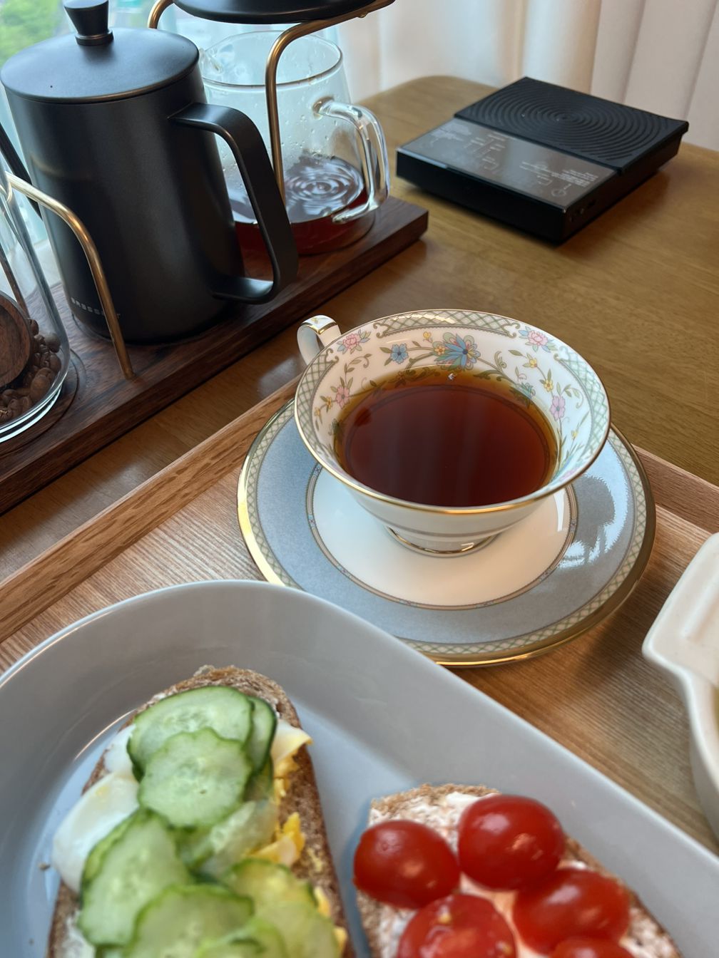 컵 하나만 꺼내서 간단하게 마셔도 되는데 굳이 설거지를 늘리는 소서까지 추가할 수 있는 여유. 그렇게 커피 한 상을 차려두고 느긋하게 바라보거나 사진을 찍을 수 있는 여유. 한 손에 휙 들 수 있는 머그와는 다르게 보다 조심스럽게 들어 올리거나 심지어 두 손을 써야 하는데도 이를 감수하는 여유.