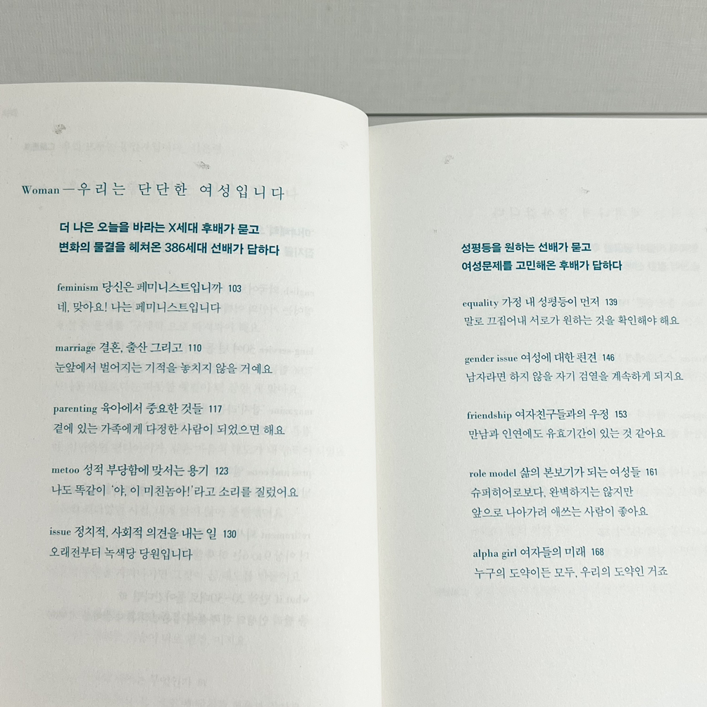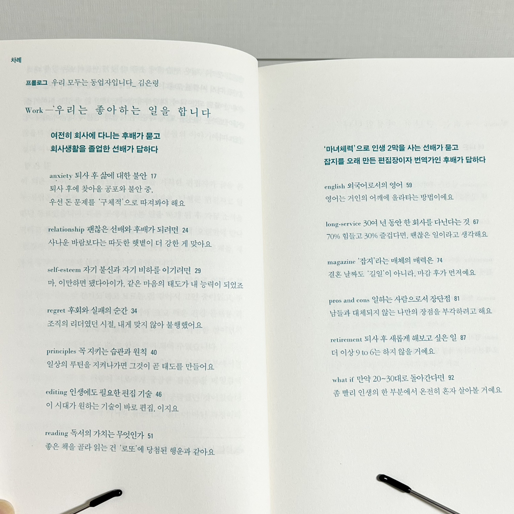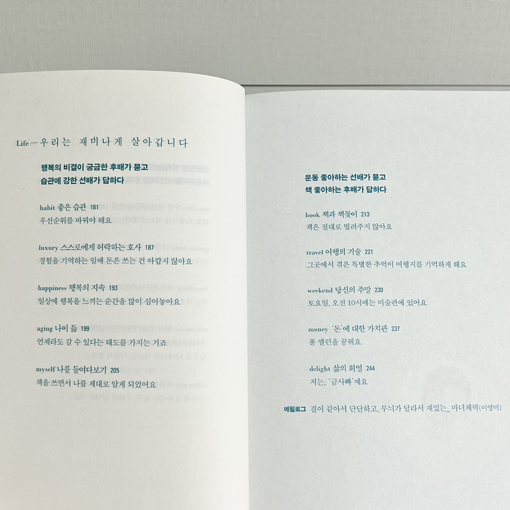두 작가가 서로에게 하는 말, 각자 삶에서 느낀 소회도 좋지만 - 무엇보다 좋았던 것은 목차. 키워드를 하나씩 끼워넣어서 잘 짜맞춘 목차를 보면서 정리의 희열을 느낀다.