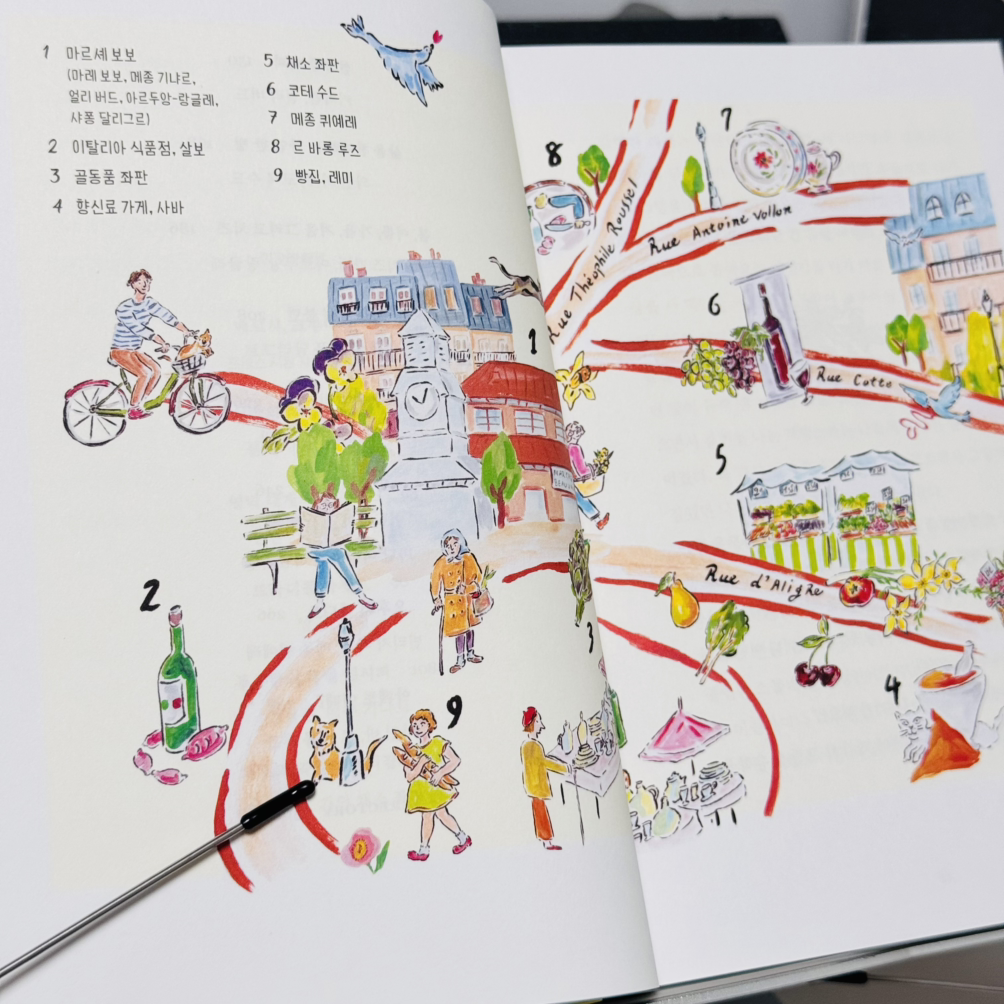 <메르시 크루아상>이라는 제목이 어찌 보면 프랑스에 대한 환상을 부추기는 클리셰 같아서 처음에는 심드렁했는데 책장을 펼치니 놀랍도록 풍성한 세계가 나온다. 오래된 파리의 시장, 그 시장 속의 가지각색의 식재료들, 사람들, 그들과의 인연. 본 제목보다도 '장바구니에 담긴 프랑스'라는 부제가 훨씬 마음에 든다.