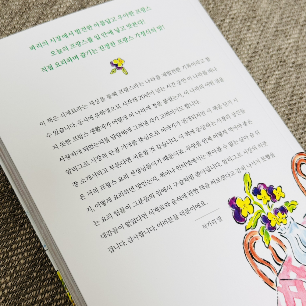 반쯤 읽다가 당장 엄마에게도 한 권 주문해서 보냇다. 분명, 좋아할 거야. 프랑스에서 살았던 기억. 그 후로도 세계 여러 나라의 시장을 둘러본 경험. 그리고 먹거리가 주는 기쁨에 크게 감화되는 취향. 아니나 다를까 엄마의 한줄평은 : 정말 사랑스러운 책이더라, 였다.