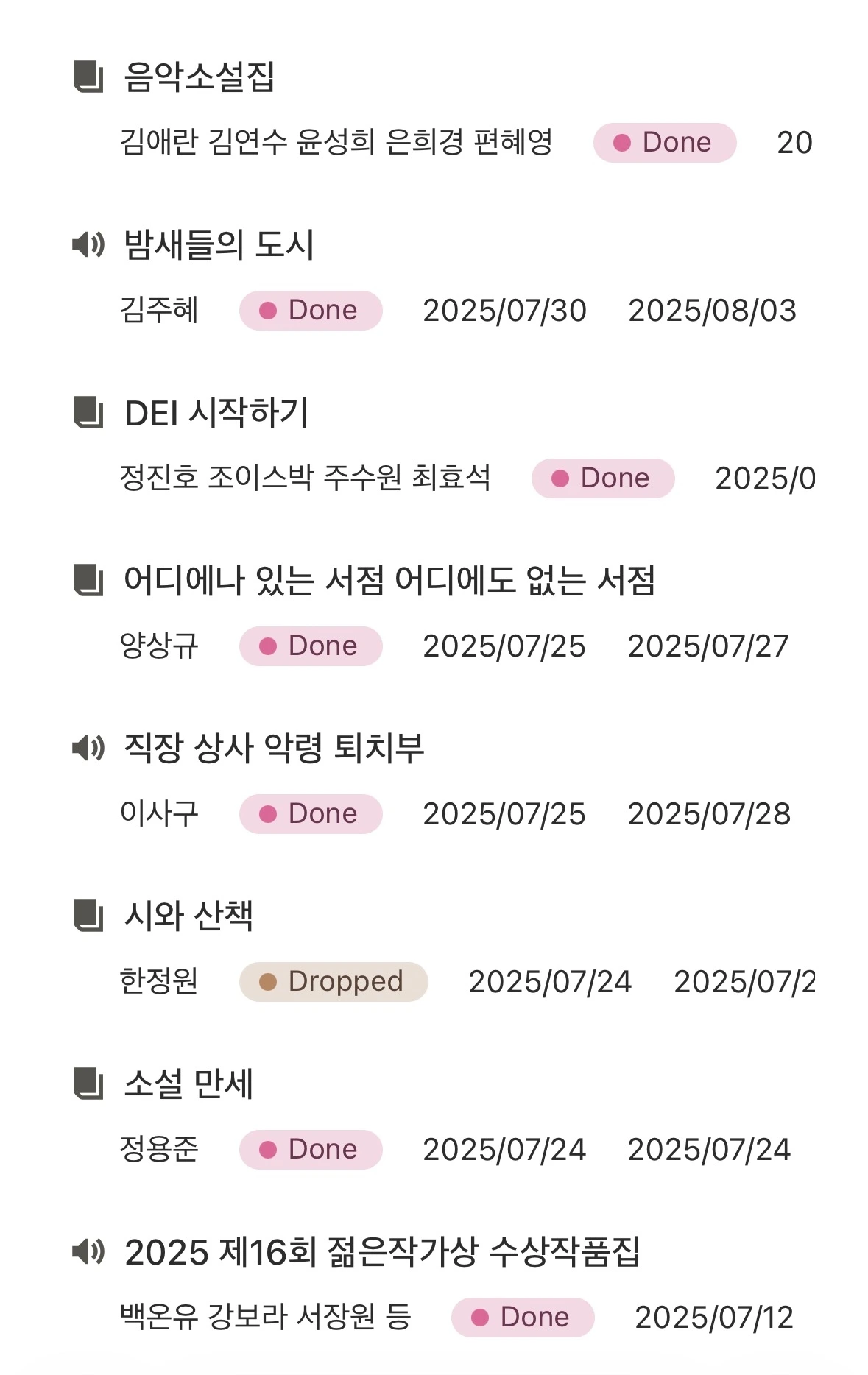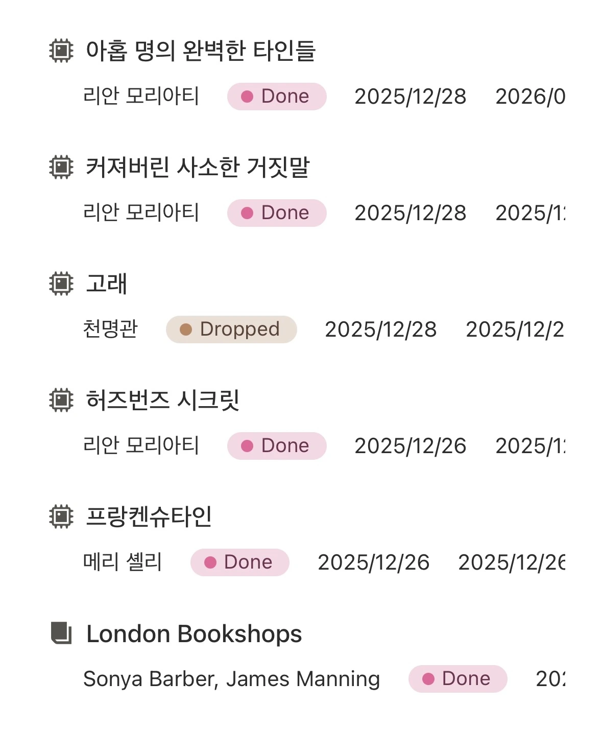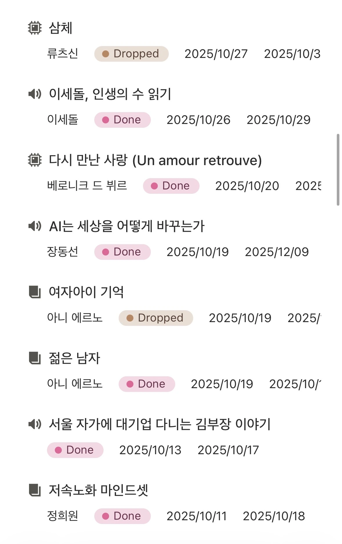다 읽은 책에 대한 소감을 남기는 것도 좋지만 중도 하차한 책들 또한 왜, 어떤 요소 때문이었는지, 기억을 남기고 싶다. 그래서 노션 카테고리에 Done/In Progress 외에 Dropped도 추가해 두었다.