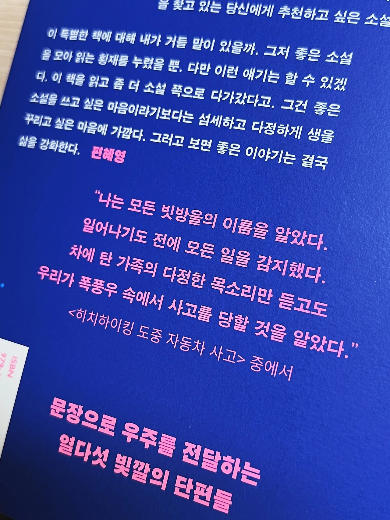 호기심을 돋우는 표지 디자인. 경쾌한 색감. 다채로운 모둠 메뉴 같은 단편소설집이라는 형태. 그리고 여러 명망 있는 소설가들의 추천사. 이 정도의 조합이라면 안 읽어볼 이유가 없다고 생각했다.