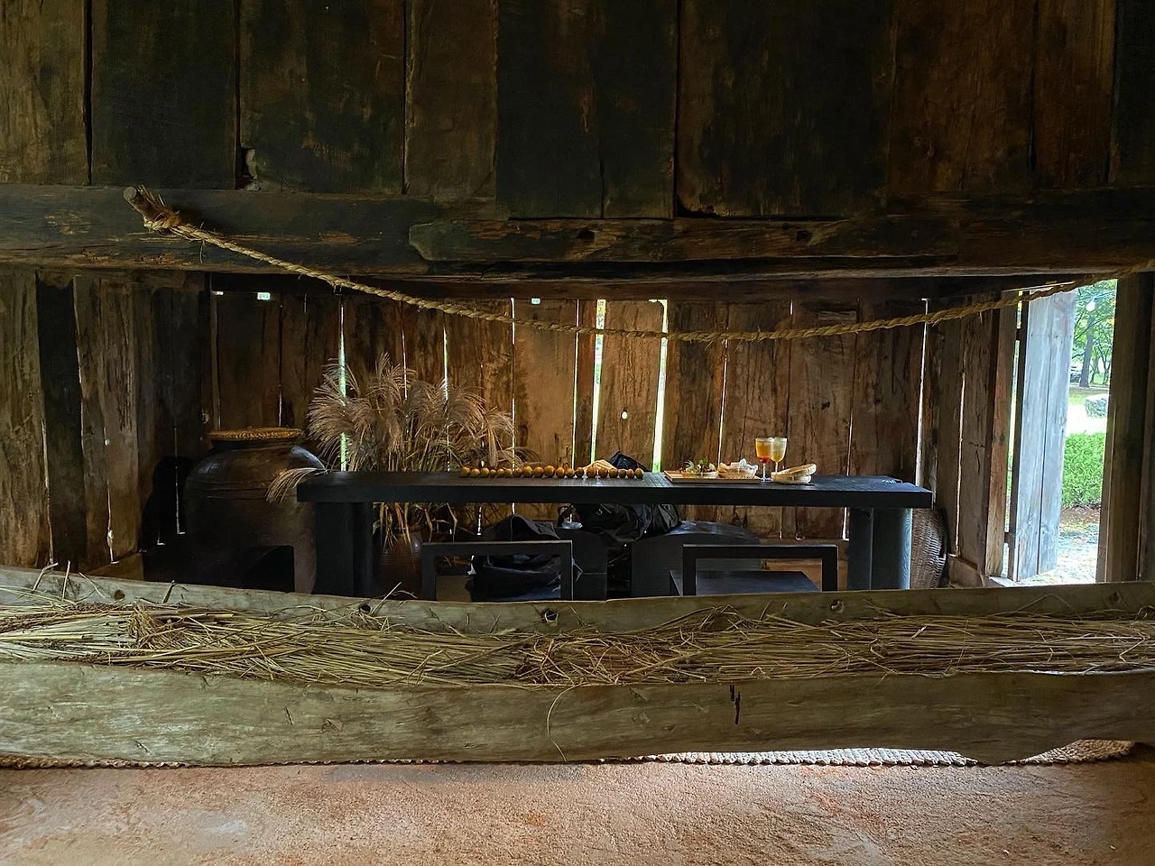 온양미술관에는 너와집이라는 전통가옥을 해체해 이축한 건축이 있다. 외양간을 빛이 적게 드는 부엌(손님맞이 방)으로 개조하고, 여물통이 공간을 길게 가로질러 건너편 부엌과의 작은 경계를 만들었다. 방으로 들어가기보다 식공간으로 한번 완충공간을 만들어, 새로운 공간에 대한 불안함과 긴장감을 해소하는 경험을 할 수 있었다.