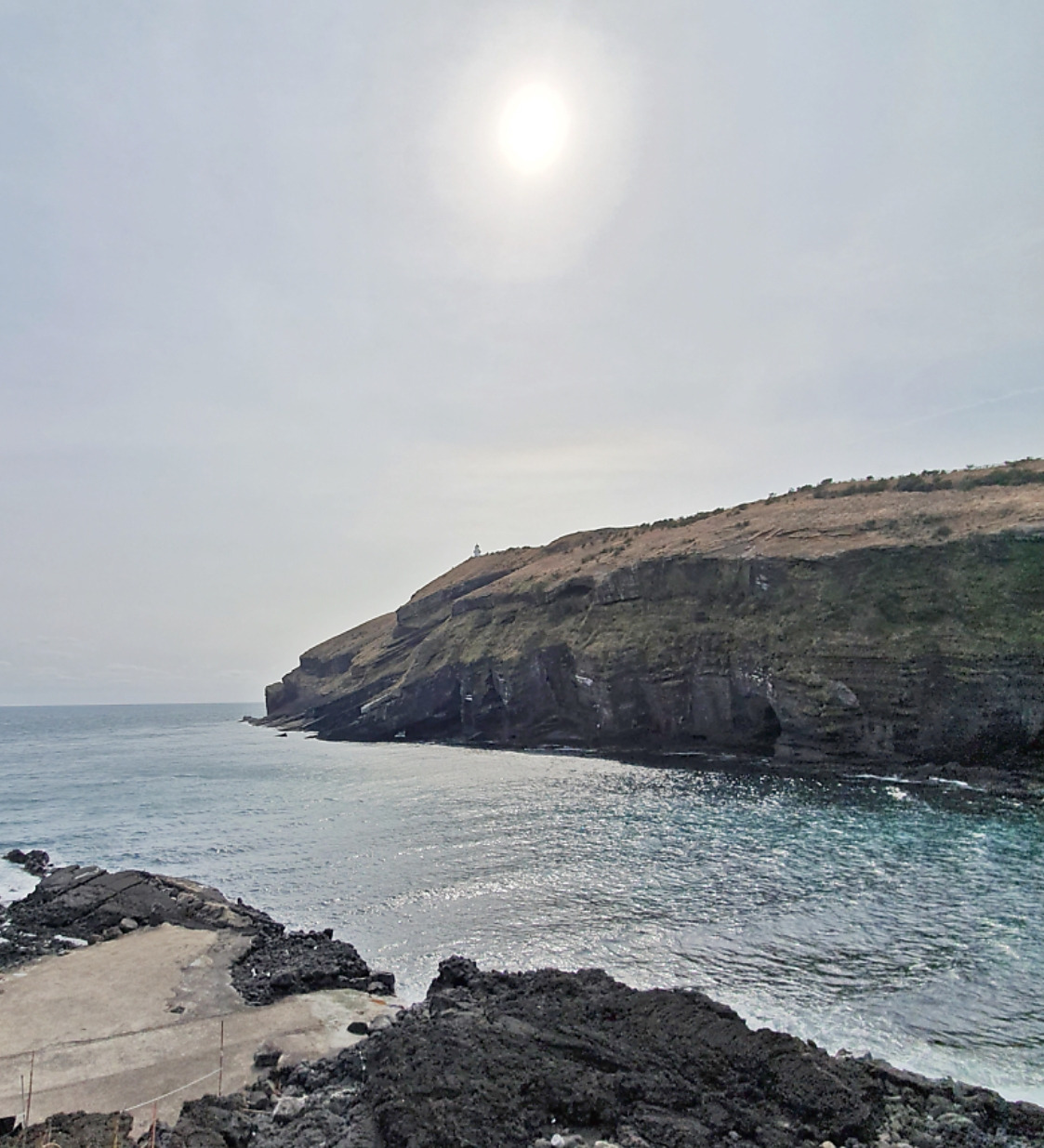 근처 편의점 앞에 차를 주차한 후, 파란 제주 하늘과 그 아래로 끝없이 펼쳐진 수평선을 마주할 수 있는 용담이호해안도로를 따라 산책하며