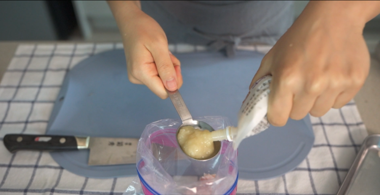 지퍼락에 소금누룩 2T를 넣고 썰어둔 닭고기를 넣어 30분간 재 줍니다.