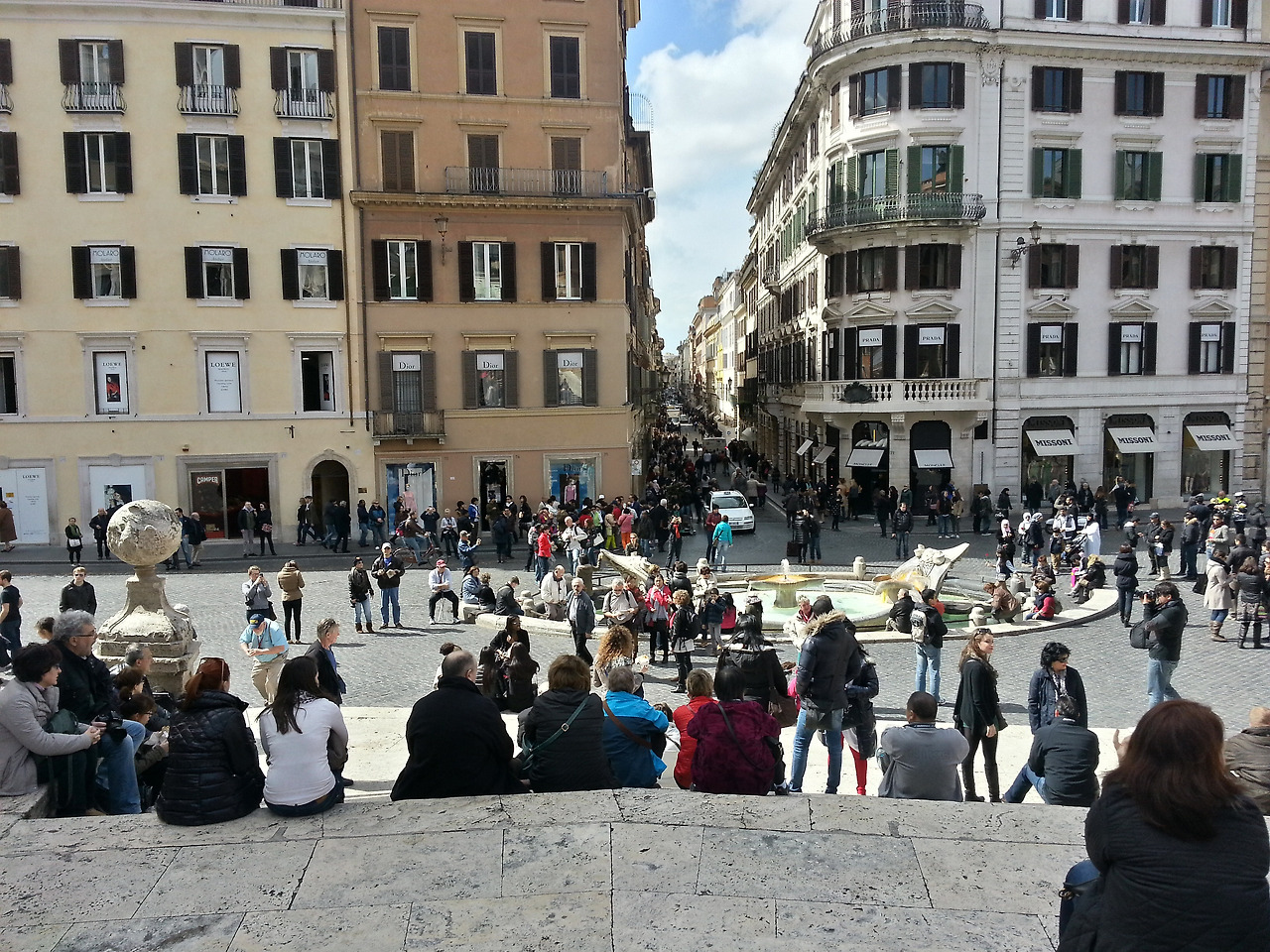 오늘은 바티칸 성당에 새로 취임한 교황의 인사말이 있는 날이었다. 생각지도 못하게 우리 로마 여행 때 그런 일이 생기다니!! 엄청나게 많은 사람들이 바티칸 광장에 모였고 각 나라 인사들과 취재진들도 있었다. 우린 거긴 정신없을 것 같으니 다른 날 가보자고 하고 스패니쉬 스텝에 먼저 도착했다. 사진 찍고 놀다가 샾들 구경하러 내려왔는데 잘 안보이던 한국사람들이 몽클 래어 가게 안에 많이 있었다. 역시 ㅋㅋ 명품을 좋아하는 한국인들..ㅋㅋ