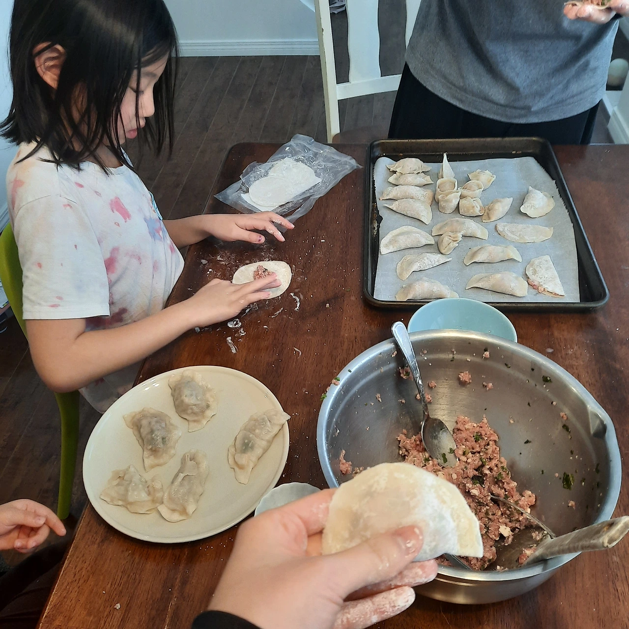 다음에 또 한다면 동그랑땡 만들 때처럼 온갖 야채를 넣고 해 볼 생각이다. 김치도 좀 넣고 ㅎㅎ 생각보다 너무 쉬웠다. 어렸을 땐 새해나 설날, 추석 이럴 때 온 가족이 둘러앉아 만두피도 직접 빚어서 만두를 대량 생산하던 때가 있었다. 할머니, 할아버지, 엄마 아빠, 자녀 5 명인 우리 집은 대 가족이 사는 집이라 그런 날은 온 가족이 동원되어 공장처럼 몇 시간이고 만두만 만들었다. 그런 기억이 나에게 남았는지, 오늘 식탁에 둘러앉아 만두를 만드는데 내심 흐뭇했다. 내가 어느덧 엄마가 되어 어릴 적 해오던 것들을 우리 아이들과 함께 하다니. 새삼 이미 어른이지만, 정말 어른이 된 것 같은 기분이었다.