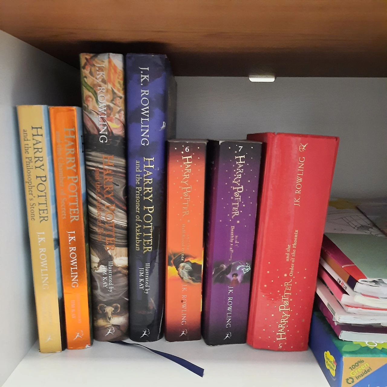 그러다 영유아 책이 생기면서 낮에 책을 읽어주기 시작했다. 그때는 뭐 그림책 이거나, 누르면 소리가 나는 촉감책이었던 것 같다. 아이가 점점 크면서 책에 글씨도 늘어가고 또 작아져 갔다. 최근에 해리포터 시리즈를 일 년이 조금 넘은 시간에 걸쳐 끝마쳤다. 남편이 밤마다 큰애에게 한 챕터씩 읽어 주는데 30분 이상이 걸리기도 한다. 처음엔 아이가 잘 이해하고 따라와 줄까 싶었는데, 괜한 걱정이었다. 스토리 안에 푹 빠져들어 조금만 더 읽어달라고 조르기 일쑤였다. 어떨 땐 책을 읽다 토론도 하고, 또 어떨 땐 내가 만약 해리였다면 어떻게 했을까 상상해 보기도 한다. 나는 영화로만 봐 왔었는데, 남편과 큰애가 시리즈를 거의 다 끝낼 때쯤 1권을 집어 들었다. 작년에 나도 굉장히 재밌게 마지막 책까지 끝냈고, 그렇게 해서 둘째 빼고 온 가족이 해리포터를 다 읽게 되었다. 남편은 둘째가 크면 또다시 이 책을 정 주행할 생각에 들떠있다.