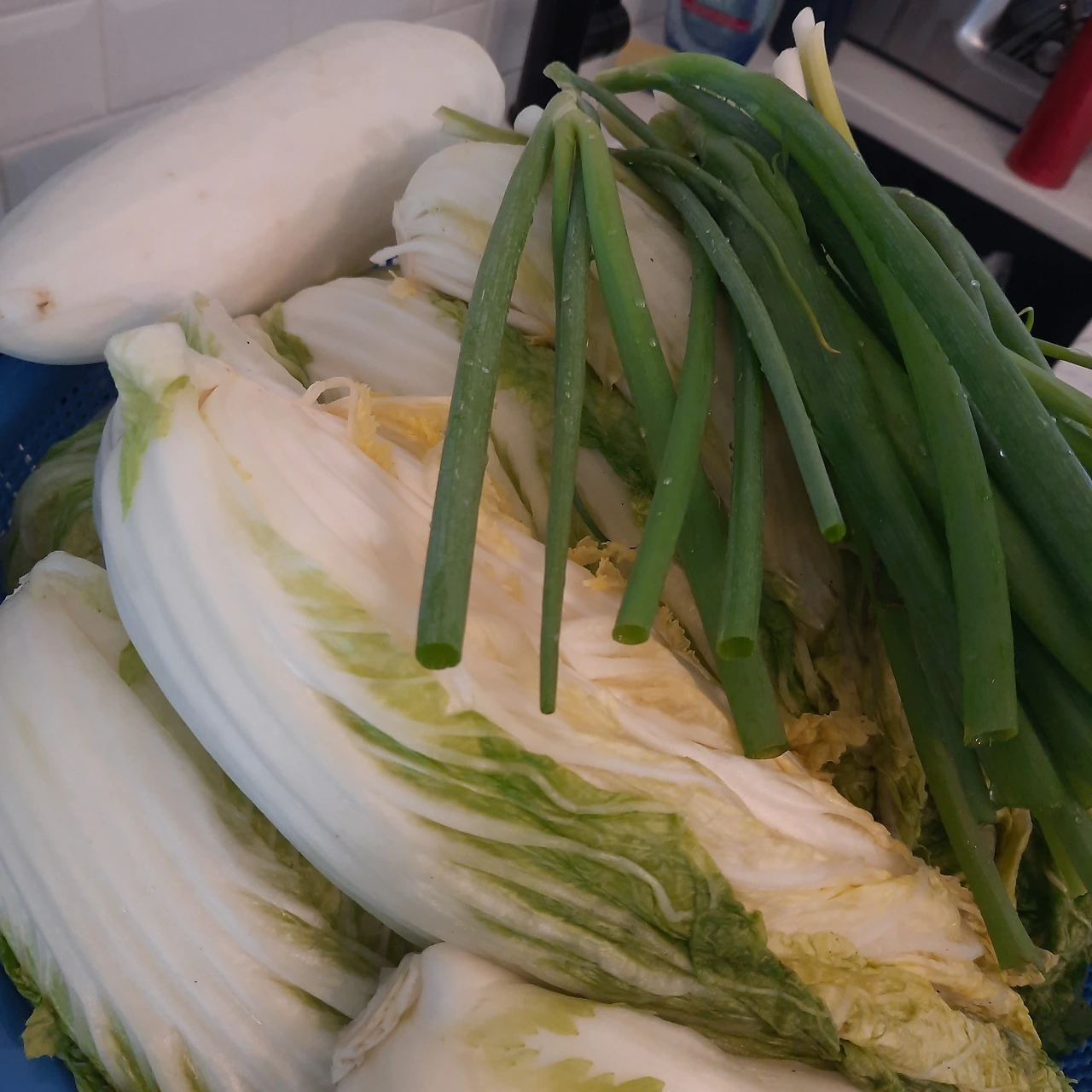 장은 내가 보기로 하고 이것저것 샀다. 큰 배추가 9-10포기쯤 들어 있었던 것 같은 배추 한 박스와 파 몇 단 굵은소금 한 봉지, 생강 등을 샀고 나머지 필요한 재료는 우리 집에 있는 것으로 해결하기로 했다. 요즘 배추와 무값이 금값인데 3가정이 재료비를 나누니 부담도 줄고 좋았다.