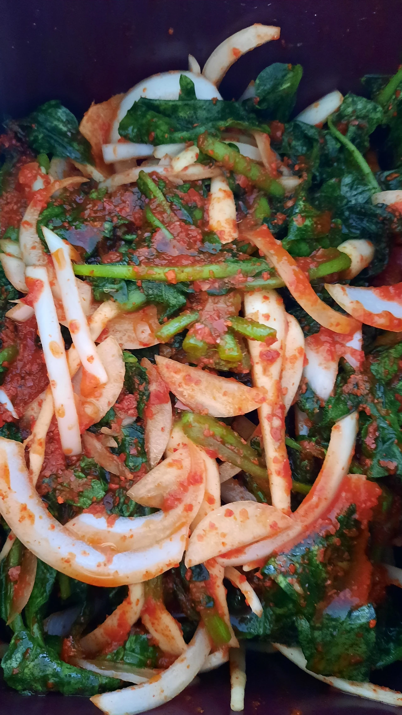 내가 씨앗부터 키웠으니 열무의 무 부분도 거의 다 김치 하는데 썼는데 나중에 보니 잘라낼걸 그랬나 싶기도 했다. 조금 쓴 맛이 나는 것도 같다. 열무를 잡아 뽑은 날 저녁, 굵음 소금에 열무를 한 시간 정도 절인 후, 흐르는 물에 여러 번 씻고 준비해둔 양념에 버무려 열무김치를 완성했다. 빨간 고추가 없어서 넣지 못했고, 지난번 김치 만들 때 새우젓을 다 써버려서 새우젓도 넣지 못했지만, 멸치액젓과 굵은소금, 양파, 찹쌀풀, 다진 마늘로 양념을 만들어 냈다.