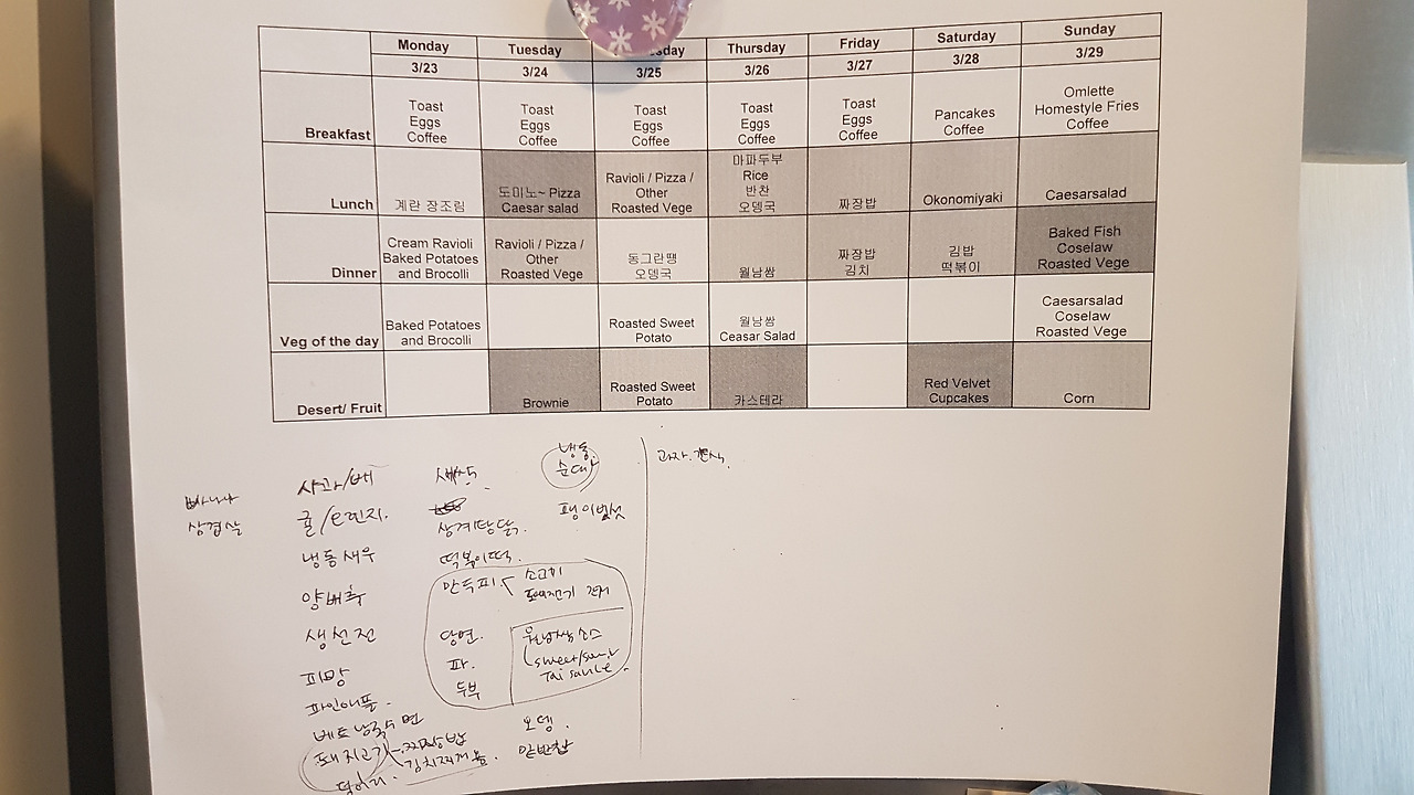 분위기 전환으로 우린 일주일치 메뉴 회의로 주제를 넘겼다. 그것또한 완전 진지해서 웃음을 참아야 했다. 컴터를 하나씩 키고, 구글 엑셀 쉐어로 테이블을 만들어 아침, 점심, 저녁 메뉴와 장보기 리스트를 적었다. 너무 심한 사재기는 안하려고 하는데, 그래도 일주일 보단 앞으로는 이주씩의 음식을 장보려고 한다.