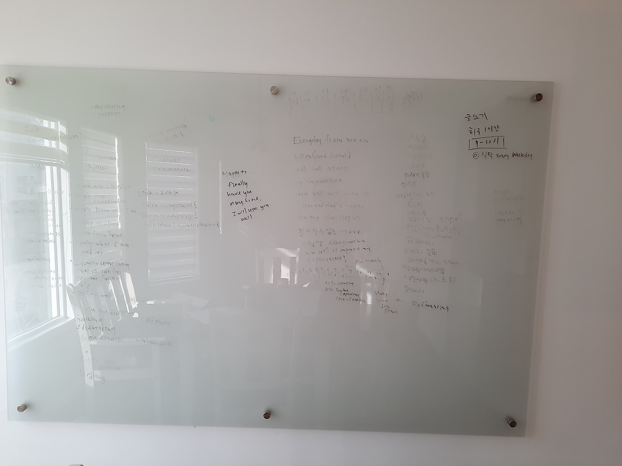계획을 좋아해서 식탁 앞에 한 벽을 다 차지할 만한 유리 보드도 샀다. 이걸 잘 쓸까? 싶었는데 엄청 잘 쓰고 있다. 모든 아이디어를 그곳에 적는다. 요즘엔 우리가 그렇게 노래를 부르고 있는 은퇴 후 삶에 대해 많은 아이디어들을 적곤 한다.