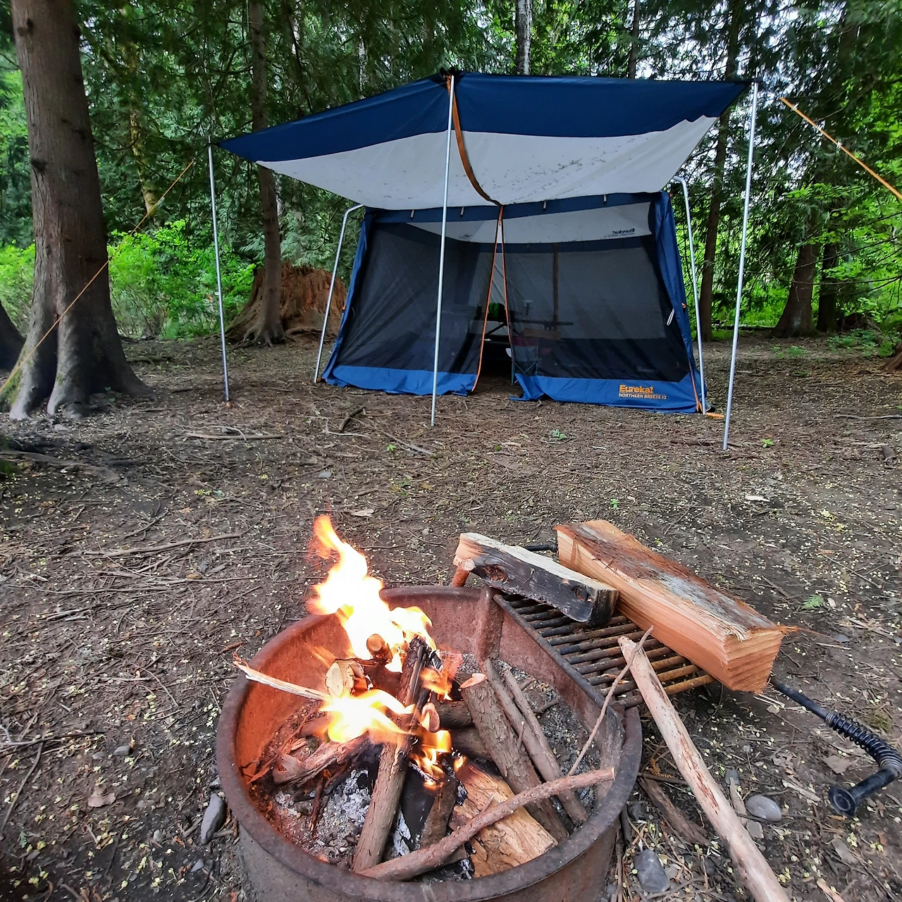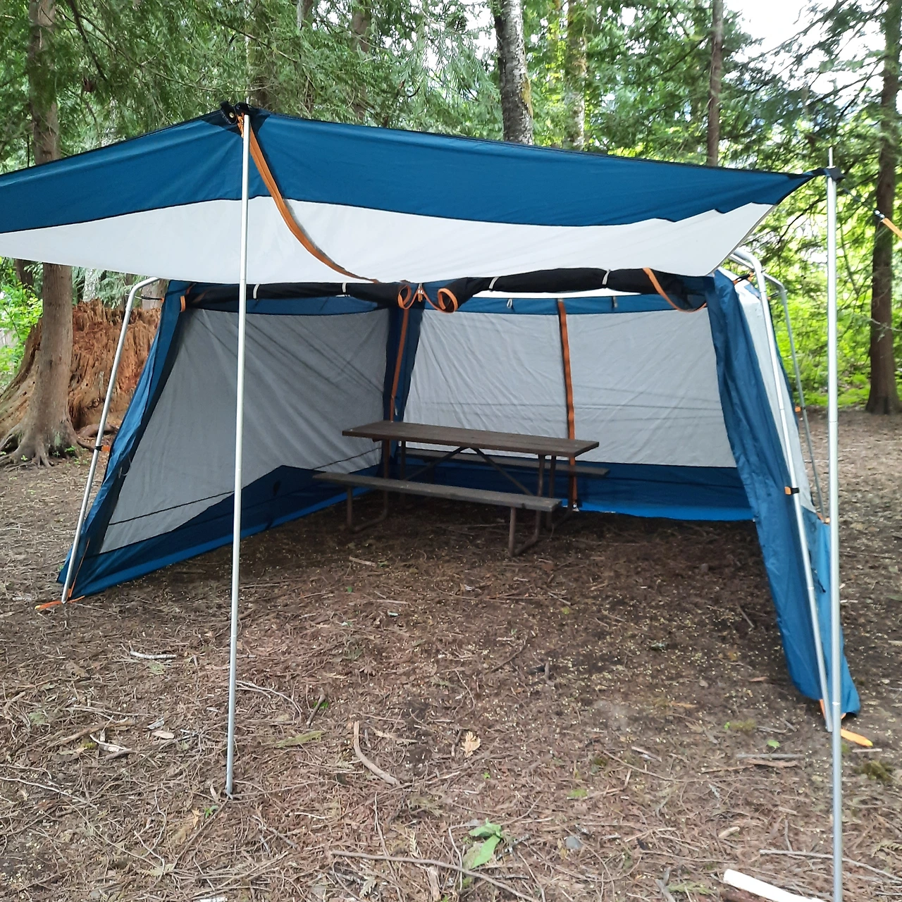 연간 회원권을 끊고 처음으로 2박 3일 시험 삼아 캠핑을 했는데, 둘째 날은 비도 많이 오고 밤에 온도도 5도 가까이로 떨어졌었다. 다행히 난로 2개를 트니 천하무적으로 따뜻했다. 또 새로 산 장비는 portable toilet이다. 새벽에 애들이 깨서 화장실 갈 때 간이로 들고 다니던 요강? 같은 쉬통은 버리고 제대로 된 간이 화장실을 샀다. 그다음 장만한 물건은 리빙 쉘터다. 비가 오면 비를 막아줄 수 있고, 메쉬 스크린도 있어서 벌레도 막아줄 수 있는 물건을 원했다. 꽤 오래 뒤졌는데 마음에 딱 드는 쉘터를 찾기가 쉽지 않았다. 2박 3일 캠핑을 오려니 더 이상 미룰 수 없어서 다시 인터넷을 뒤지던 중 성훈이가 12x12 feet 짜리 아주 괜찮은 쉘터를 찾아내어 바로 스토어에 가서 픽업해 왔다.