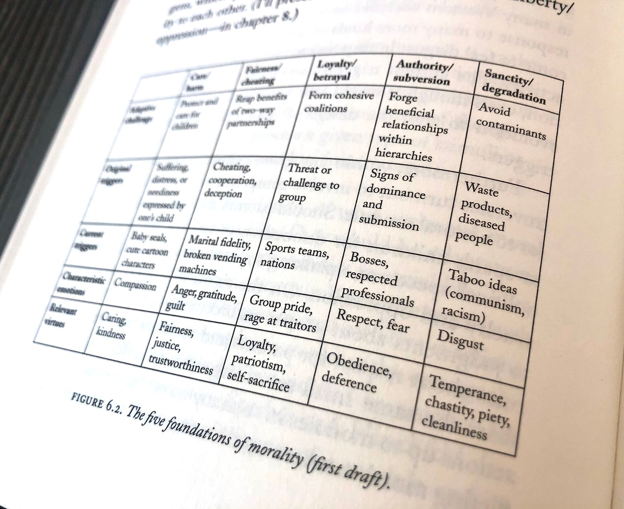 저자는 이 원초적인 감정에 기인한 옳고 그름을 판단하는 기준으로 인간이 가지고 있는 기본적인 다섯가지 잣대를 아래와 같이 정리한다.