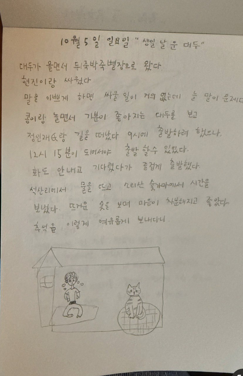말을 이쁘게 하면 싸울 일이 거의 없는데 늘 말이 문제다. 콩이랑 놀면서 기분이 좋아지는 대두를 보고 정인재씨랑 길을 떠났다. 9시에 출발하려 했으나, 12시 15분이 되어서야 출발할 수 있었다.