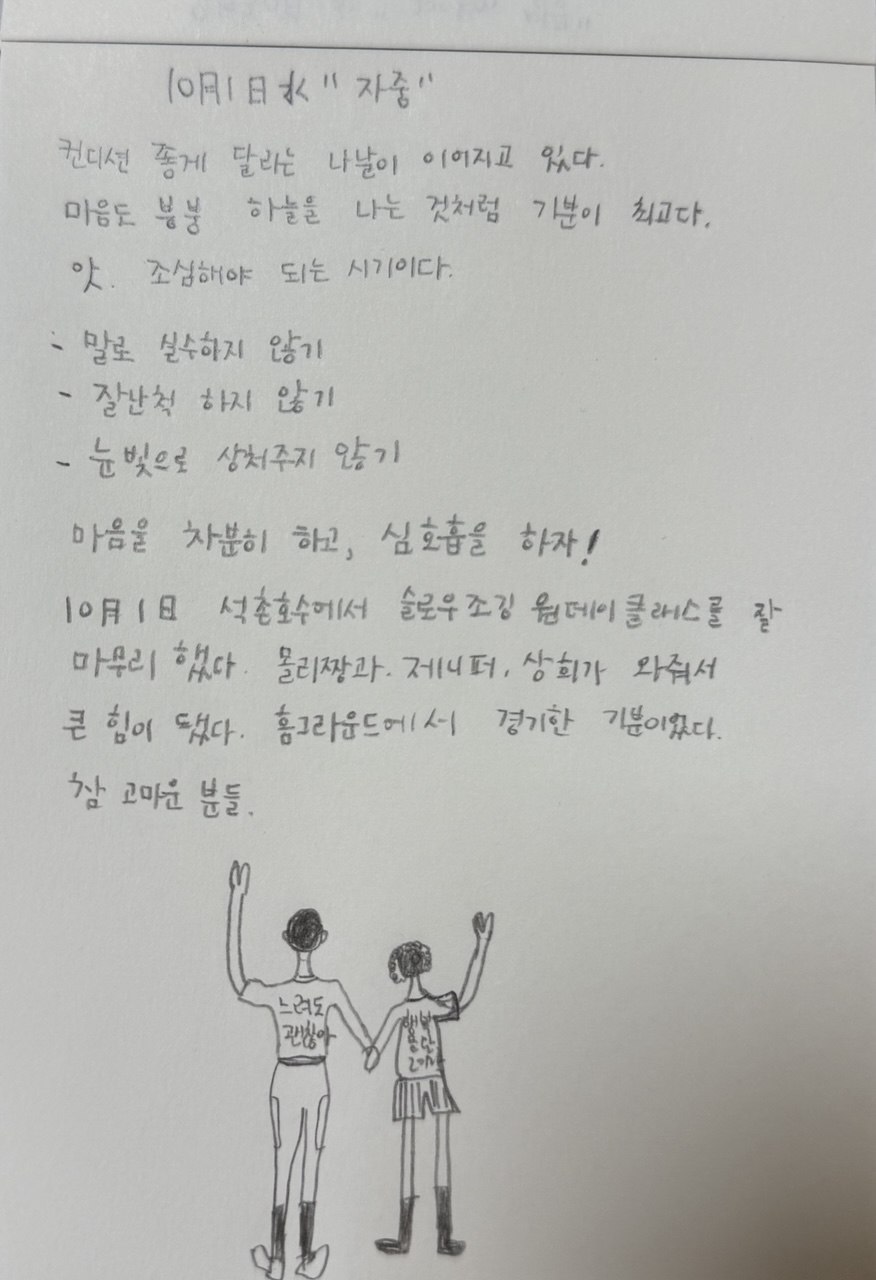 10月1日 석촌호수에서 슬로우조깅 원데이클래스를 잘 마무리 했다. 몰리짱과 제니터, 상희가 와줘서 큰힘이 됐다. 홈그라운드에서 경기한 기분이었다.