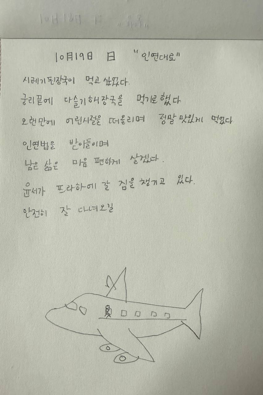 오랜만에 어린 시절을 떠올리며 정말 맛있게 먹었다. 인연법을 받아들이며 남은 삶은 마음 편하게 살겠다. 윤서가 프라하에 갈 짐을 챙기고 있다.