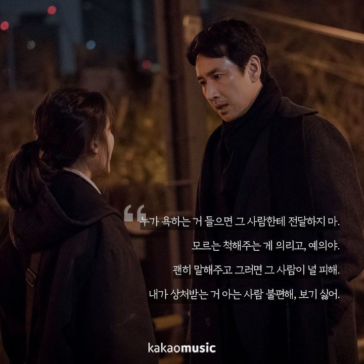 희생이라곤 없는데다, 너무나 쉽게 남 탓하고, 앞뒤 다른 이중적인 모습을 보여주는 가벼운 인간관계가 난무하던 즈음에, 바보같을 정도로 우직하고, 믿음직한 박동훈 부장(나의 아저씨 주인공인,아저씨다) 때문에 깊은 감명을 받았다. 누가 듣건 듣지 않건, 타인에 대한 평가가 한결같은 사람. 그사람 앞에서 할 수 있는 이야기만, 뒤에서도 하는 사람.
