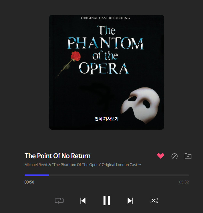 이제 너무 멀리와서 돌아갈 수는 없다는 내용인데 메인 넘버 the PHANTOM OF THE OPERA 보다 더 자주듣는 곡이다. 테잎이랑 씨디를 사서 모으던 시절에도, 타이틀곡보다 숨겨진 띵곡 찾는걸 좋아하기는 했는데 뭐 꼭 그런 마이너 성향이 있어서라기보다는 그것과는 별개로......메인넘버가 심장을 두근두근 두드린다면 이곡, 더 포인트 오브 노 리턴은, 후회와 회환이 몰려오면서 애잔하기도 하고 절망스럽기도 하지만