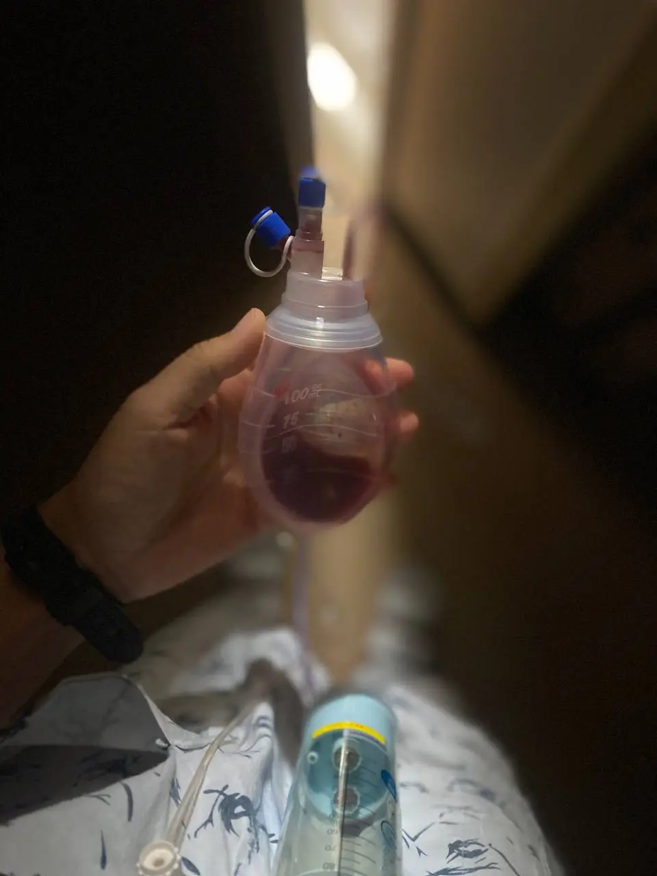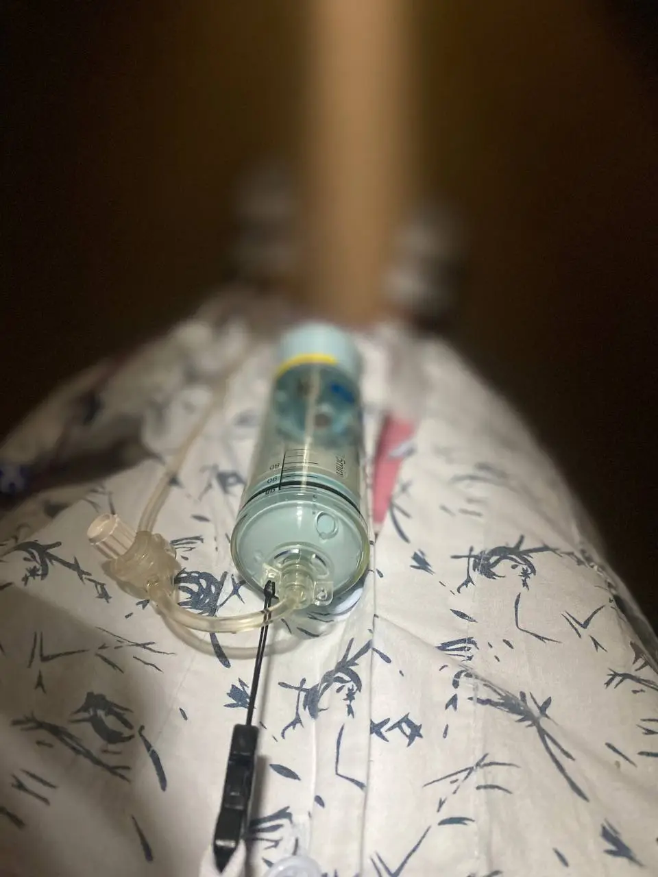 아주 아주 미미한 소량의 진통제가 조금씩 몸에 들어가는 거지만 아플때나 아플 것 같은 행동을 하기전에 미리 버튼을 누르면 빠르게 주입이 가능하다. 플라시보 역할도 톡톡히 하는 아이다. 단, 한번 누른 버튼은 15분이 지나야 다시 누를 수 있다. 배관액......저 피주머니때문에 진짜 염려가 많았다. 저게 어떻게 내 몸속에 삽입되어 안에 고여있는 피를 빼내주는건지, 저 주머니를 제거할때 얼마나 아플지......