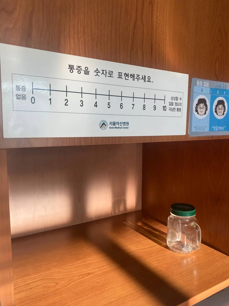 * 이튿날 처음으로 통증과 선생님이 다녀갔다. 진통제에 대해 말씀주셨는데 아픈거 굳이 참지말고 진통제 맞으라는 이야기를 여러번들었다. 쌩으로 참지 마시길!