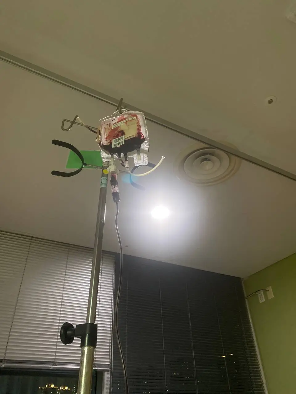 도중에 갑자기 혈압이 급속도로 내려가고 체온이 올라 수혈을 중단했다가 30분 가량 수혈대신 수액을 맞고 안정을 취한뒤 다시 수혈을 이어가면서.