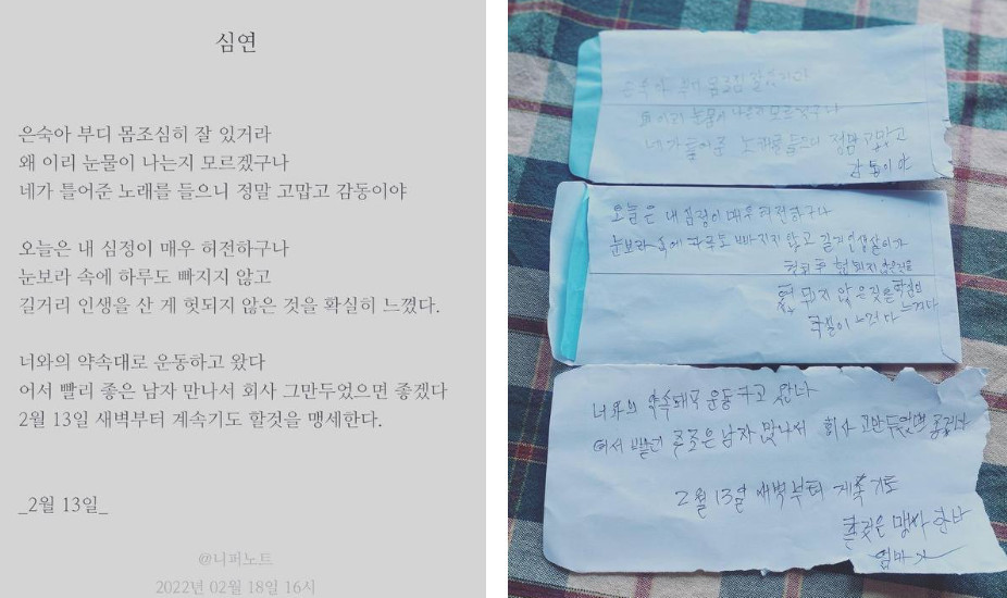 내가 엄마 일기 아니었으면 엄마가 요즘 화장실 잘 가는지 못 가는지 알턱이 없잖아. 일기 덕에 비타민도 끊기지 않고 화장실도 매일 가니까 좋은 거 아니야? 이게 다 엄마가 쓴 일기 덕분인거잖아”