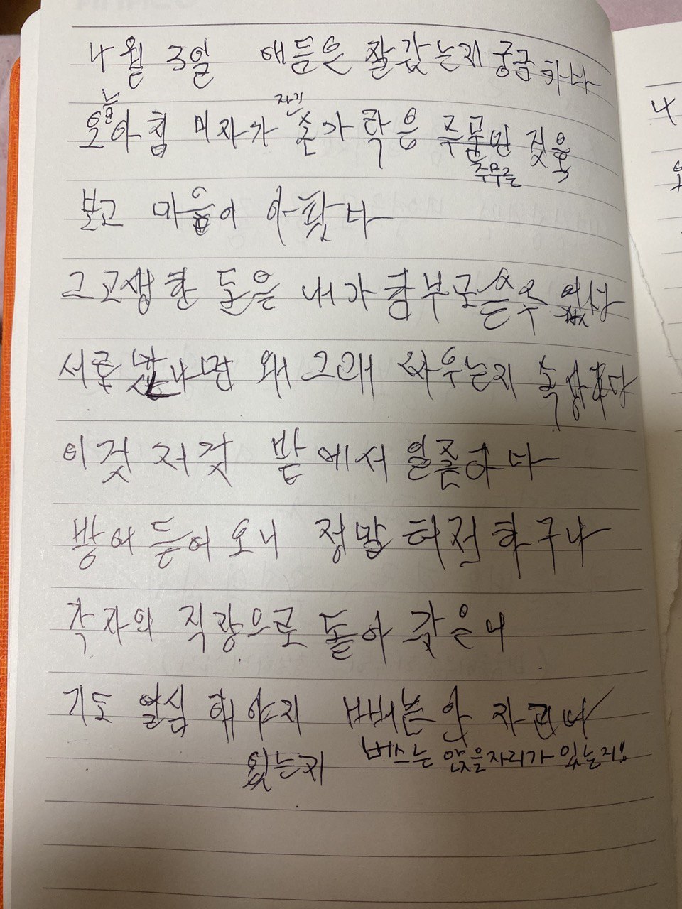4월 3일엔 둘째 언니랑 싸웠는데, 엄마 일기장에 속상하다고 쓰여있어서 언니랑 반성을 많이 했다. 엄마를 기쁘게 하지는 못할망정 속상하게 하지는 말아야지, 싸우더라도 이제 엄마 있을 때라도 좀 덜 싸워야지, 뭐 그런 반성. 나이도 쉰, 마흔둘인데. 허구한 날 싸운다. 자매는 그런 건가 우리가 그런 건가. 참.
