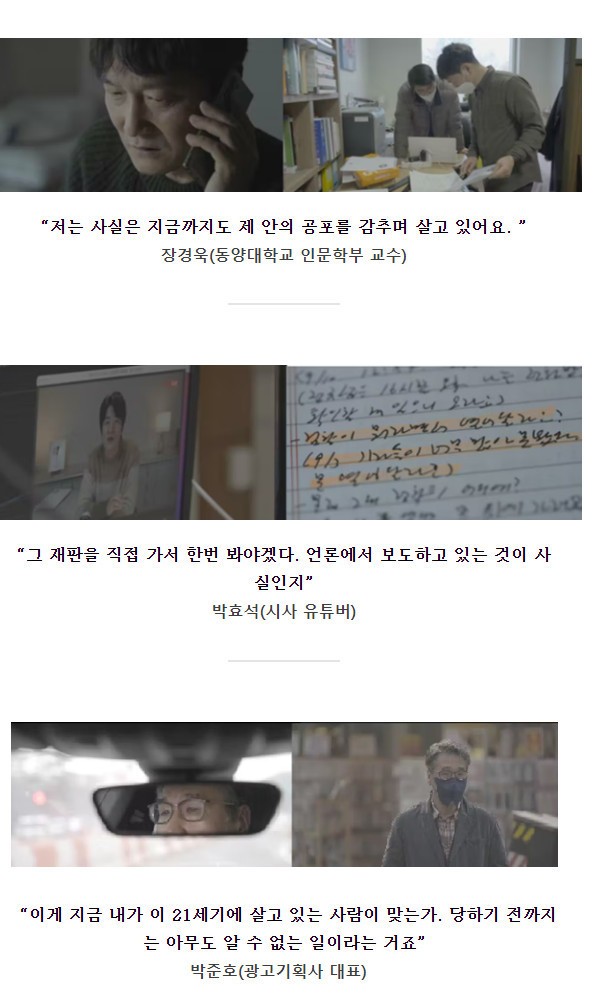 이 일련의 사태에 대해 1도 모르는 사람이 다큐를 보더라도 누가 위협을 가하며 겁을 주고 거짓말을 하는지 누가 잘못이 없더라도 당할 수 밖에 없는 처지에 놓였는지 단박에 알 수 있다는 점이다.