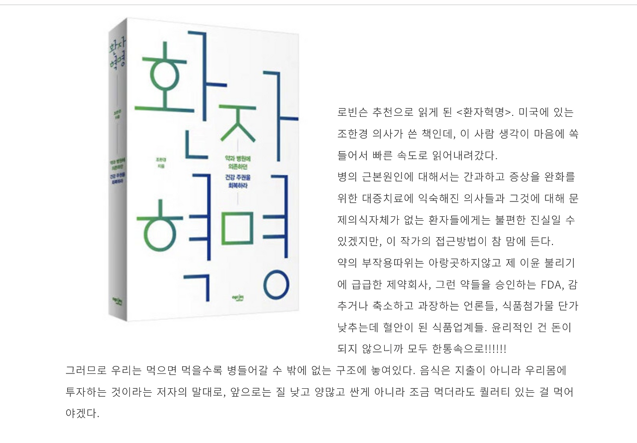 착한여우: 충분한 수면, 운동하기, 음식 잘먹기, 비타민과 미네랄 섭취하기. 유사나를 1년동안 열심히 먹었는데 계속 아파서 의아했는데 이 책을 읽고 원인을 알았다. 음식을 대충먹고 운동안했던 것이 원인인것은 아닐까 생각했다. 헬스팩을 아침점심 먹어도 음식을 골고루 먹지않고+충분한 수면을 취하지 않고+운동하지 않으면 좋은 비타민을 먹어도 밑빠진 독에 물붓기라고 생각했다. 이후부터 아이들에게 음식을 하나라도 제대로 해주려고 노력하고 있다. 여에스더의 책과, 음식이 나다, 환자혁명의 공통점은 비타민은 보충제로 섭취해야 한다고 말하는 것이었는데, 소량의 비타민과 미네랄이 우리 몸을 살리는 것이니 꼭 섭취해야 한다고 느꼈다. 질병의 원인을 파악하고 그 원인부터 제거해야 한다!! 히포크라테스가 말하기를 음식으로 고치지 못하는 병은 약으로도 못고친다고 했다!!