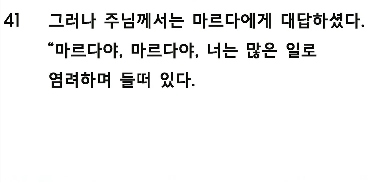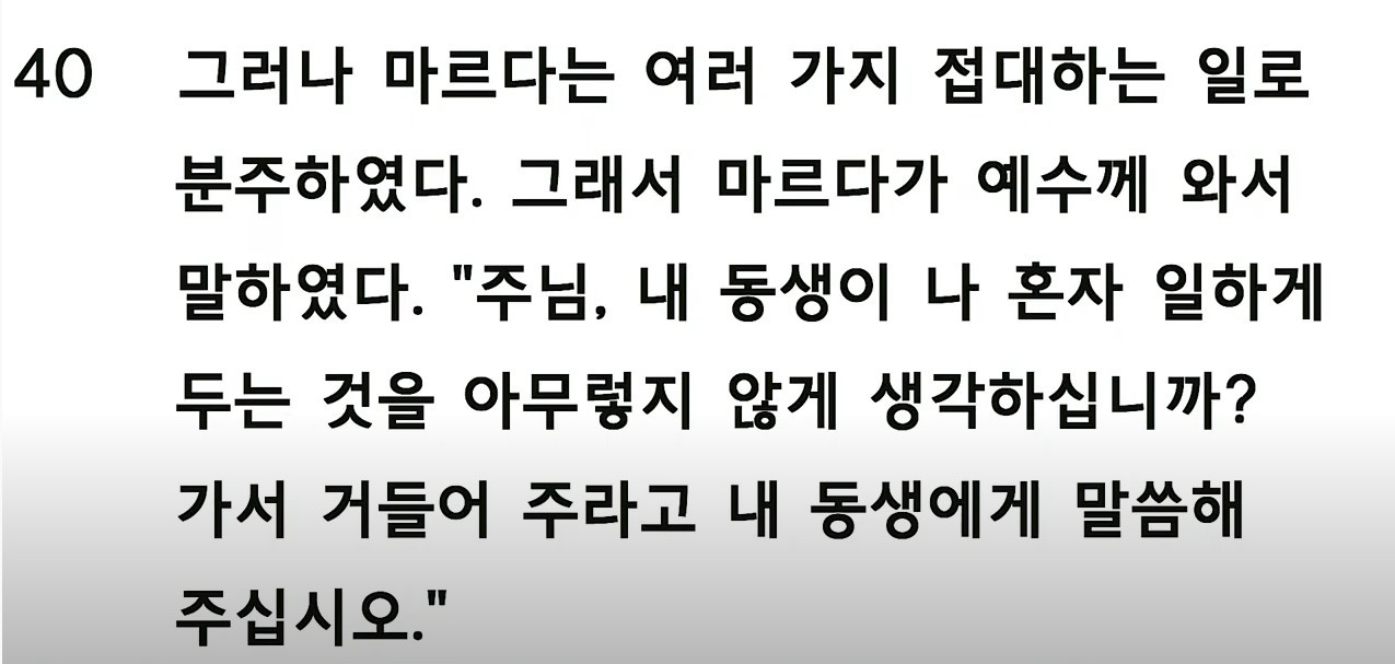 마리아에 대한 마르다의 불평은 이렇게 정리할 수 있다. "왜 자신이 감당할 수 없는 일을 하면서 염려할 뿐 아니라 다른 사람을 시기하고 미워하니?"라고 해석된다.