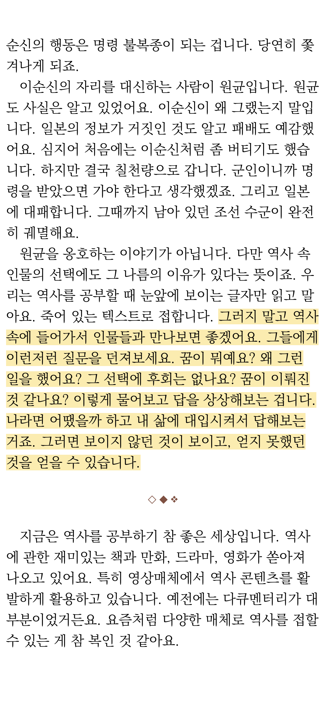 (잉카의 아타우알파와 고구려의 연개소문을 언급한 후) 그렇기 때문에 누구나 시시때때로 자신을 돌아봐야 합니다. 역사를 통해서 자신의 위치를 돌아볼 줄 알아야 합니다. 일이 잘 풀리지 않을 때는 무론이고, 순항하고 있을때도 그렇습니다. 지금 정말 괜찮은가? 그냥 되는대로 흘러가고 있는건 아닐까? 무언가 잘못된건 없을까? 내가 원하는 방향으로 가고 있는게 맞을까? 자꾸 물어봐야 해요. 스스로에게 질문하는것을 멈추면 그저 관성에 따라 선택하고 관성에 따라 살게 됩니다.