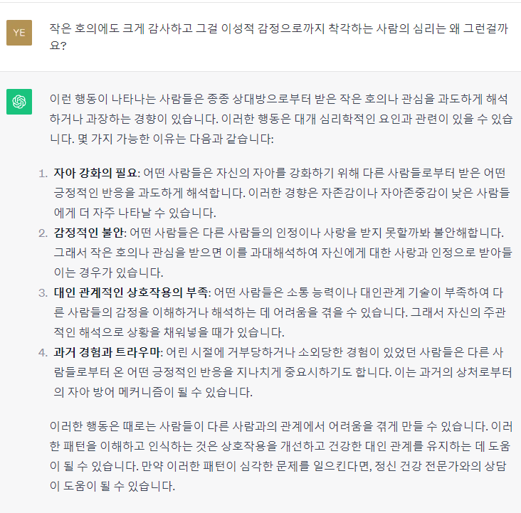 본격적인 <슬픔>을 논하기전에 내가 가진 오래된 병에 대해 짚어봐야 할 것 같아서 잠시 시간을 할애하고자 한다. 금사빠, 쉽사빠. 작은 호의를 과도하게 해석하는 나같은 사람의 심리는 뭘까, 늘 궁금했다. 사소하고 의미없는 상대방의 작은 호의에도 크게 의미를 부여하는 유형의 사람. 심리학적 견해가 부족하기에 chat GPT에게 물어봤다. (교수님께 물어보기엔 너무 창피한 일이니까!!!) 챗 GPT에 의하면 어쨌거나 어릴적 소외당한 경험이 있고 인정이나 사랑을 받지 못할까봐 감정적으로 불안하고 자아 강화가 필요하다는데 이런 건 어떻게 개선해나가면 좋을지 참 난감하다.