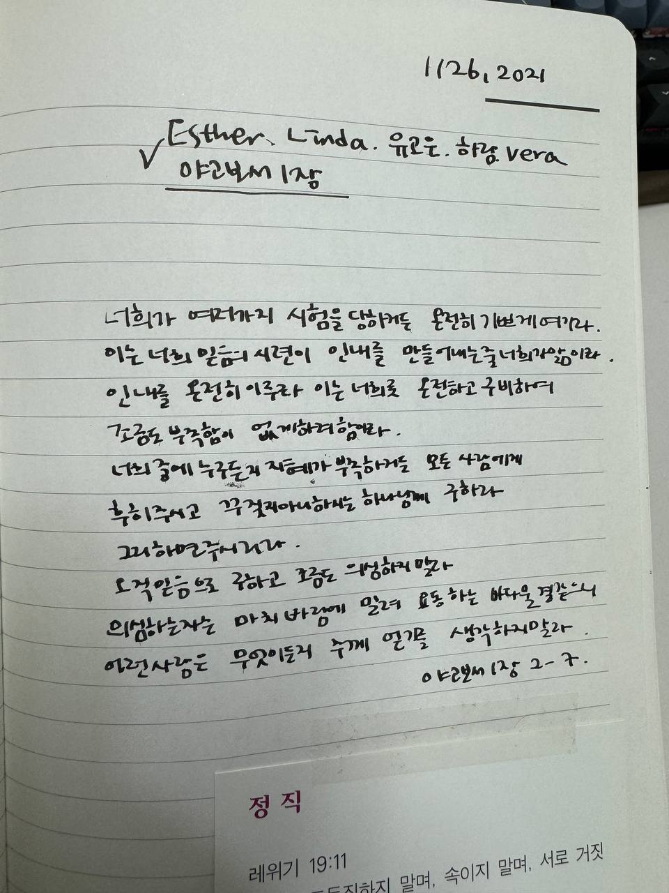 늘 어지럽지만 오늘따라 회사 책상위가 더 정신없게 느껴져서 책상위에 버릴만한 것들을 다 버리기 시작했다. 그러다 노트 한권이 손에 들어왔다. 지난 4년간 성경통독할때마다 들고 들어갔던 노트였는데 막상 버리려고 훑어보니 졸필이지만 그래도 내 기록이 담긴 노트를 버리는게 쉽지 않았다.