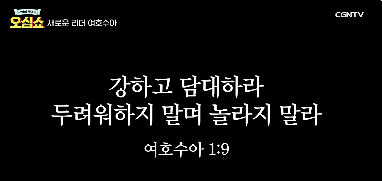 모세의 시대가 끝나고 모세의 후계자 여호와의 시대가 시작됐다. 이에 두려워하는 여호수아에게 하나님이 말씀하신다. 강하고 담대하라. 두려워하지말며 놀라지말라. 고. 여호수아가 요단강을 건너 여리고성을 시작으로 가나안을 정복하는 과정과 이스라엘 지파들이 땅을 분배하는 과정이 펼쳐진다. 다음 내용은 조혜련 집사의 '오십쇼'를 듣고 요약한 기록이다.