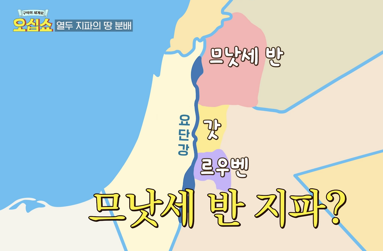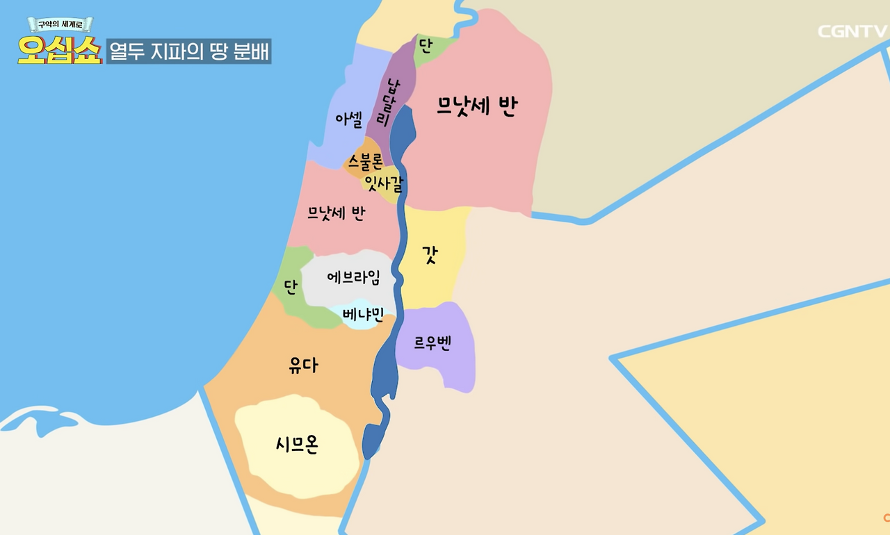 먼저, 요단강을 건너기 전부터 요단동쪽을 원했던 므낫세(일부), 갓, 르우벤 지파는 요단동쪽을 차지하게 된다. 므낫세 지파는 요단강 왼쪽에도 나머지 땅을 분배받는다.